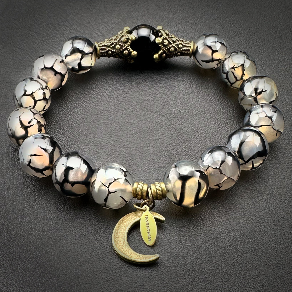 This bracelet features a striking Black Obsidian center stone, elegantly crowned and surrounded by Black and White Webbed Crystals of Black Dragon Vein Agate. Renowned for its healing properties, it helps clear mental blocks, fostering creativity and encouraging innovative thinking. A perfect piece for channeling strength, clarity, and inspiration.